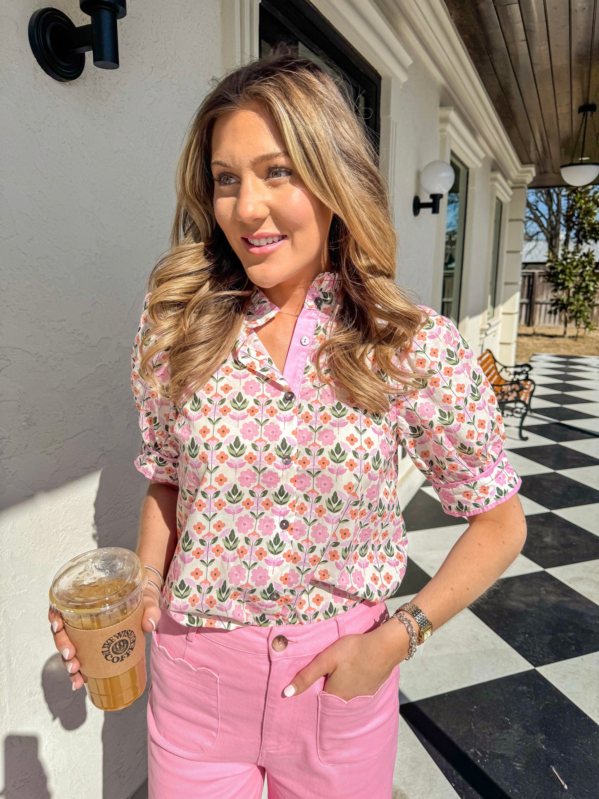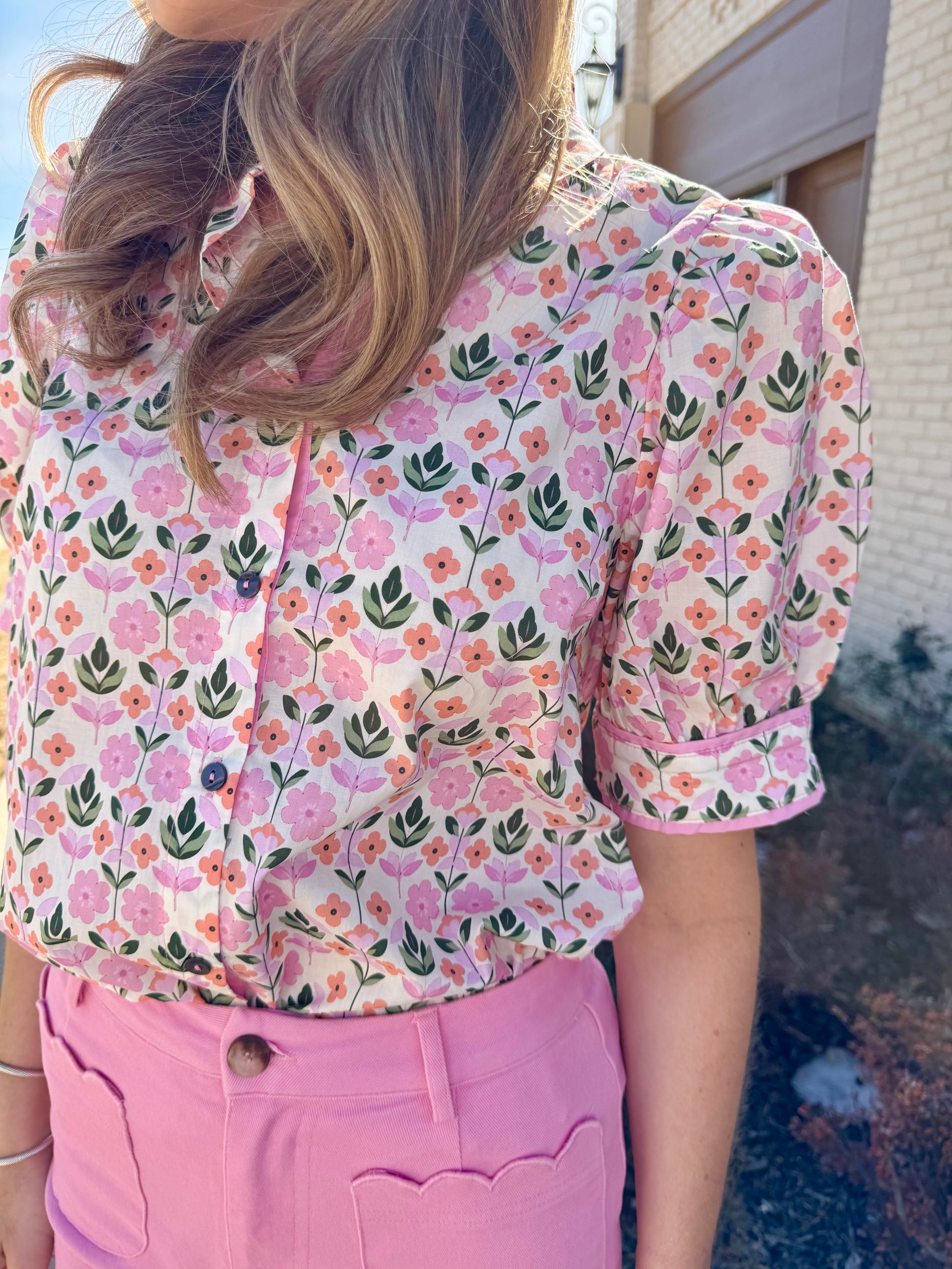 The cutest pink floral print. Adorable little puff sleeve and neck line. Runs true to size. Wearing the size small.