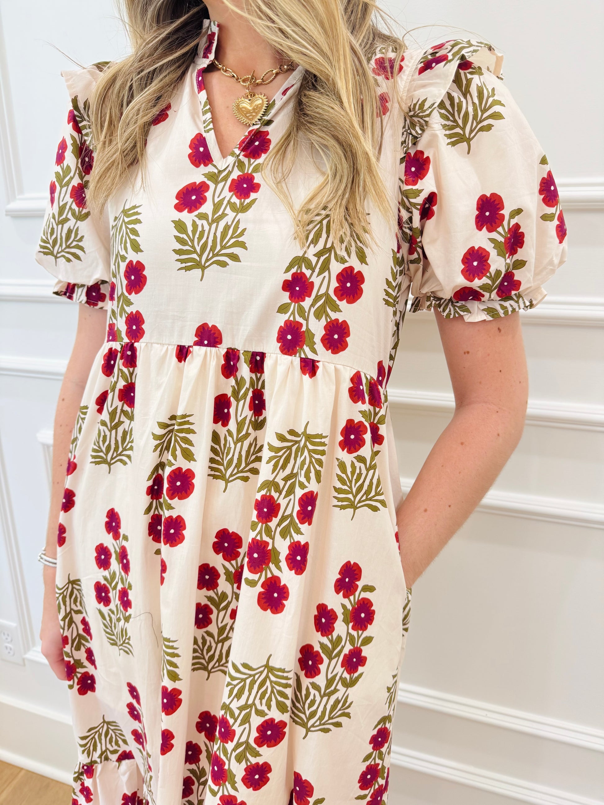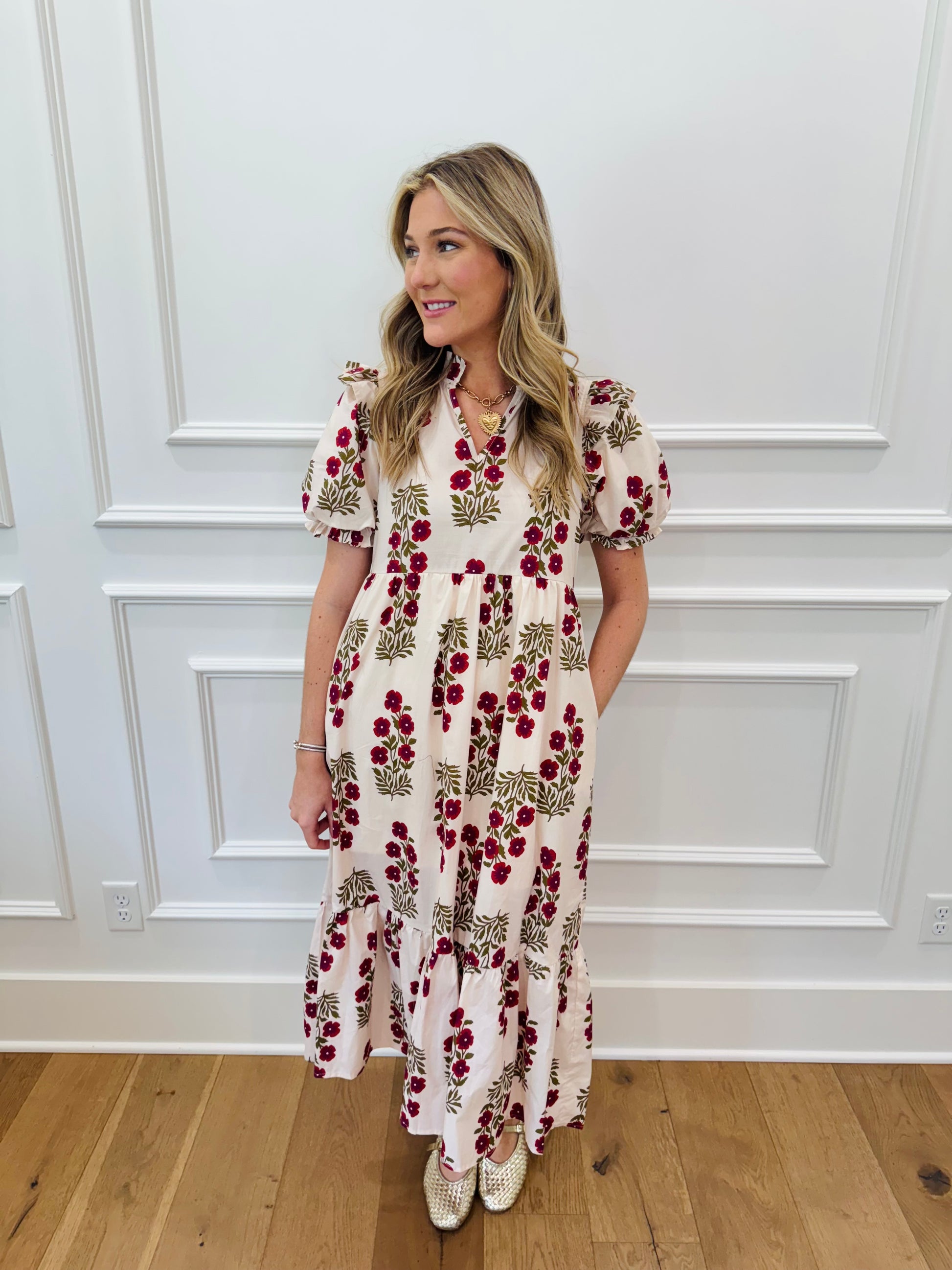 The cutest little maxi dress in an adorable large scale block print. The colors are bold and so vivid. Line with pockets! Flowy, comfy fit!