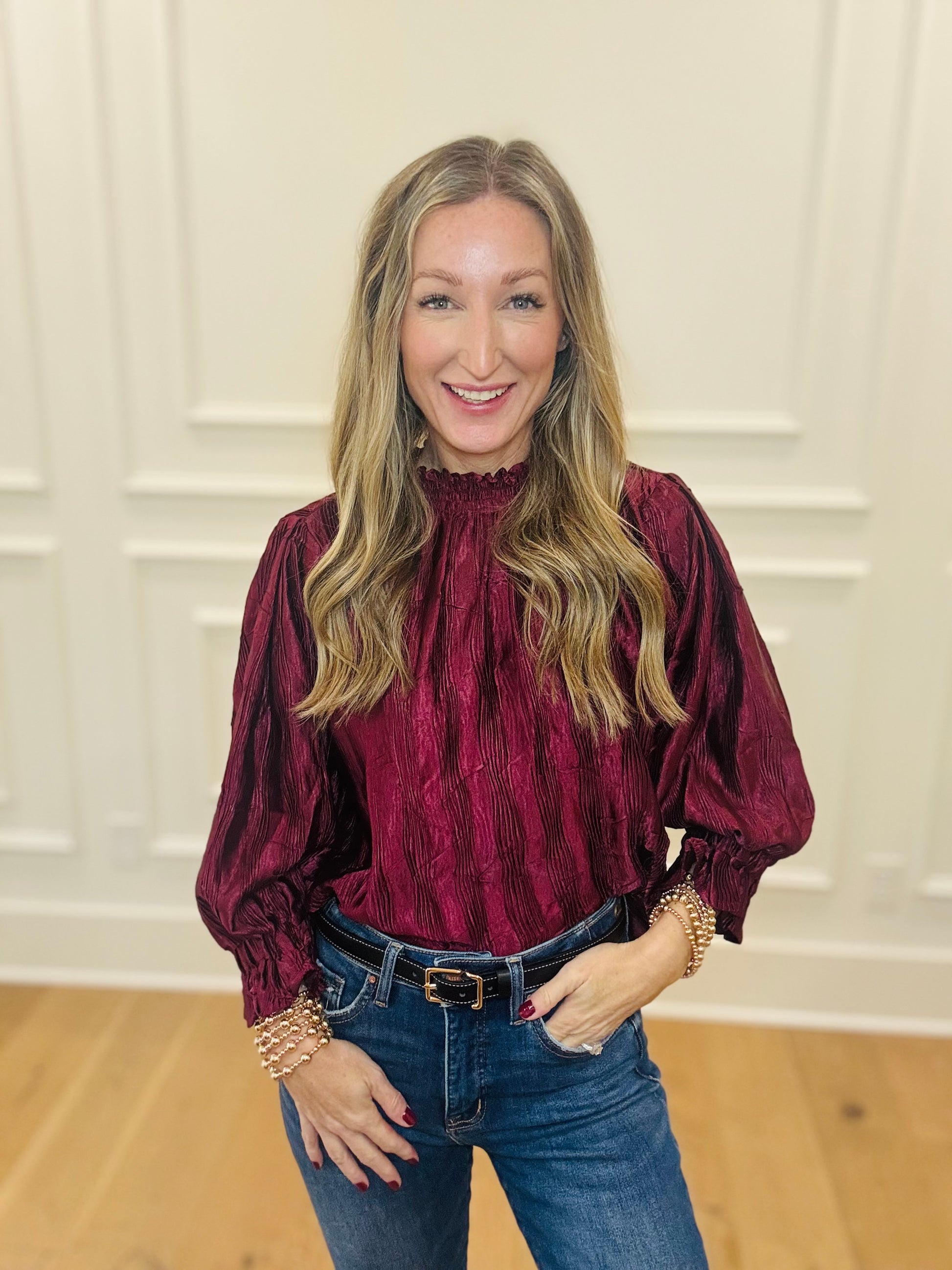 This gorgeous unique material makes this one a head turner. Super low mock neck and cropped sleeve. Comfortable material and can be worn untucked if preferred. Wearing the small