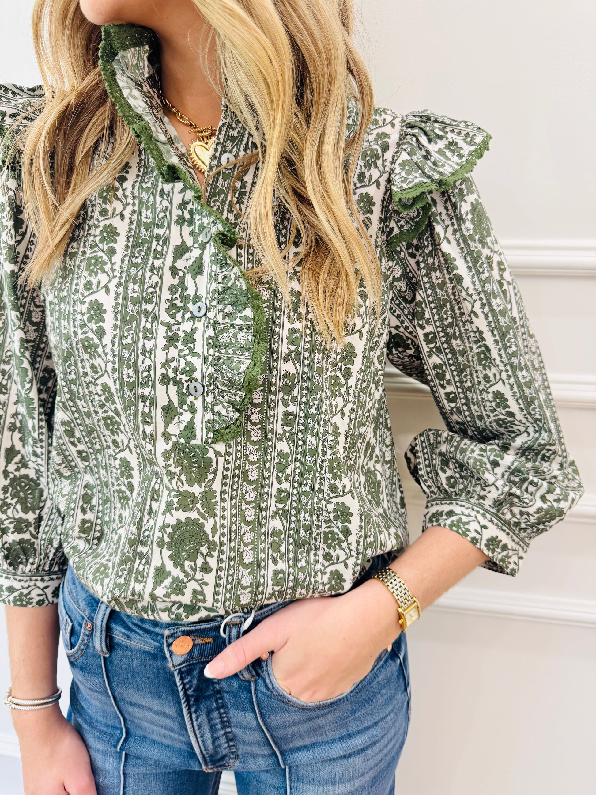 This floral print blouse with the 3/4 sleeves has the cutest little details. A feminine touch with the slight puff sleeves and petite ruffle shoulder. Pair with your favorite denim. Runs true to size. Mags in the small