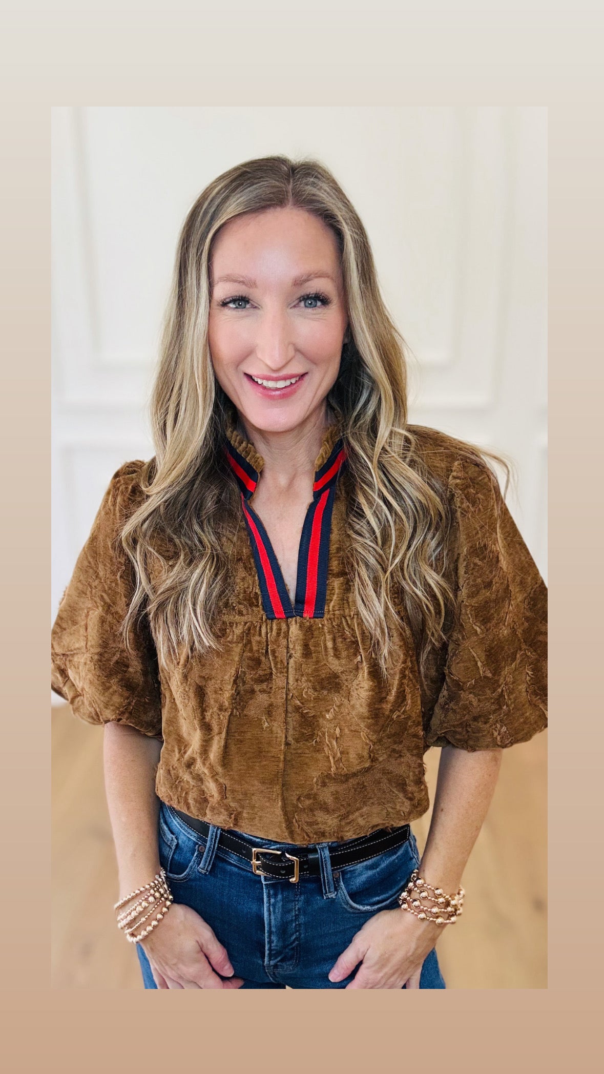 Super soft velvet top with cute puff sleeves. Trimmed out in a classic navy and red ribbon detail around the neckline. Pairs so well with dark wash denim. Wearing the medium. Runs true to size