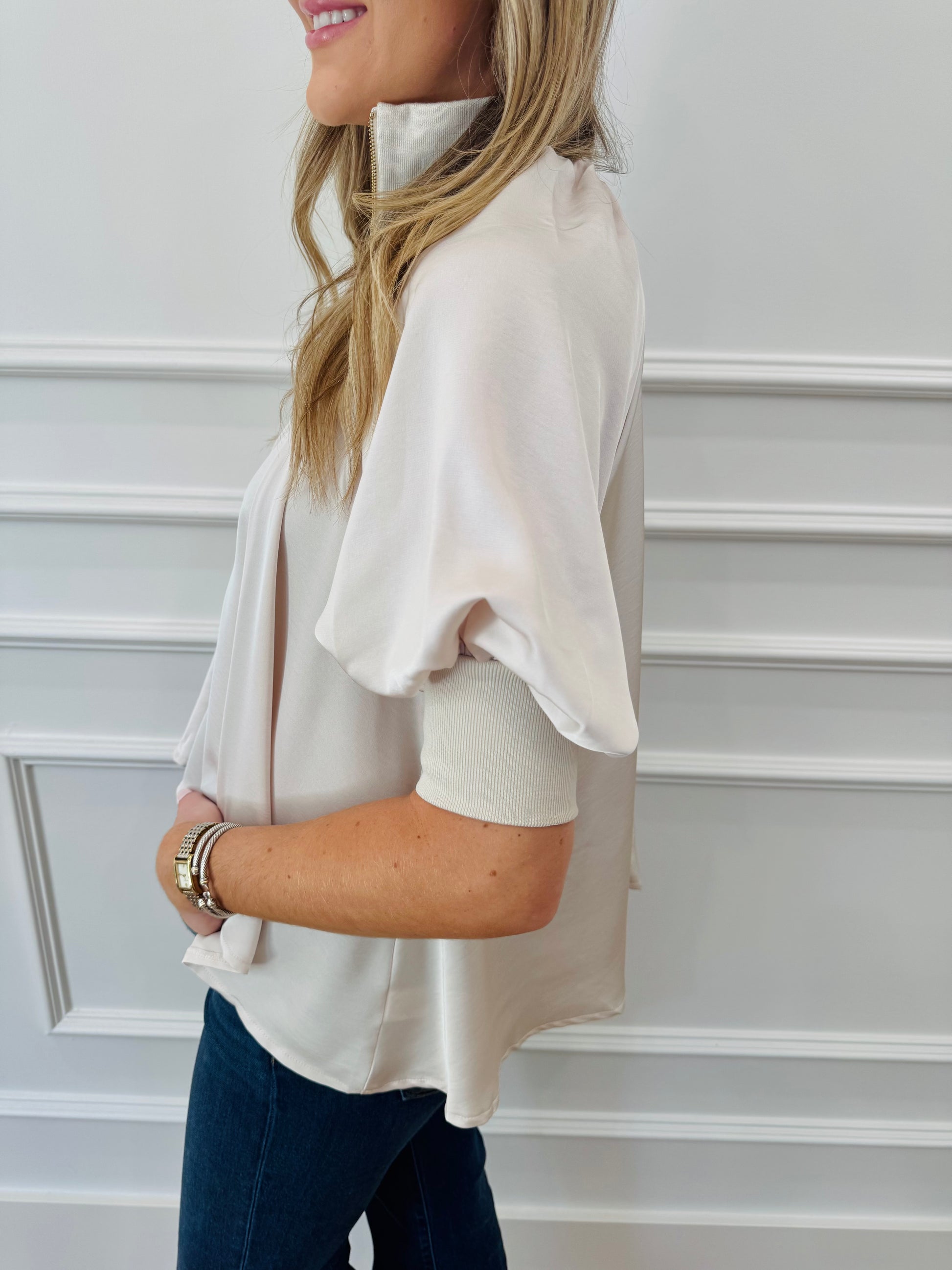 This satin sheen look with the gold zipper accent and popped collar is THE LOOK. So classy. Swing style don’t can be worn untucked or easily tucked in if you prefer. Runs true to size. Mags in the small