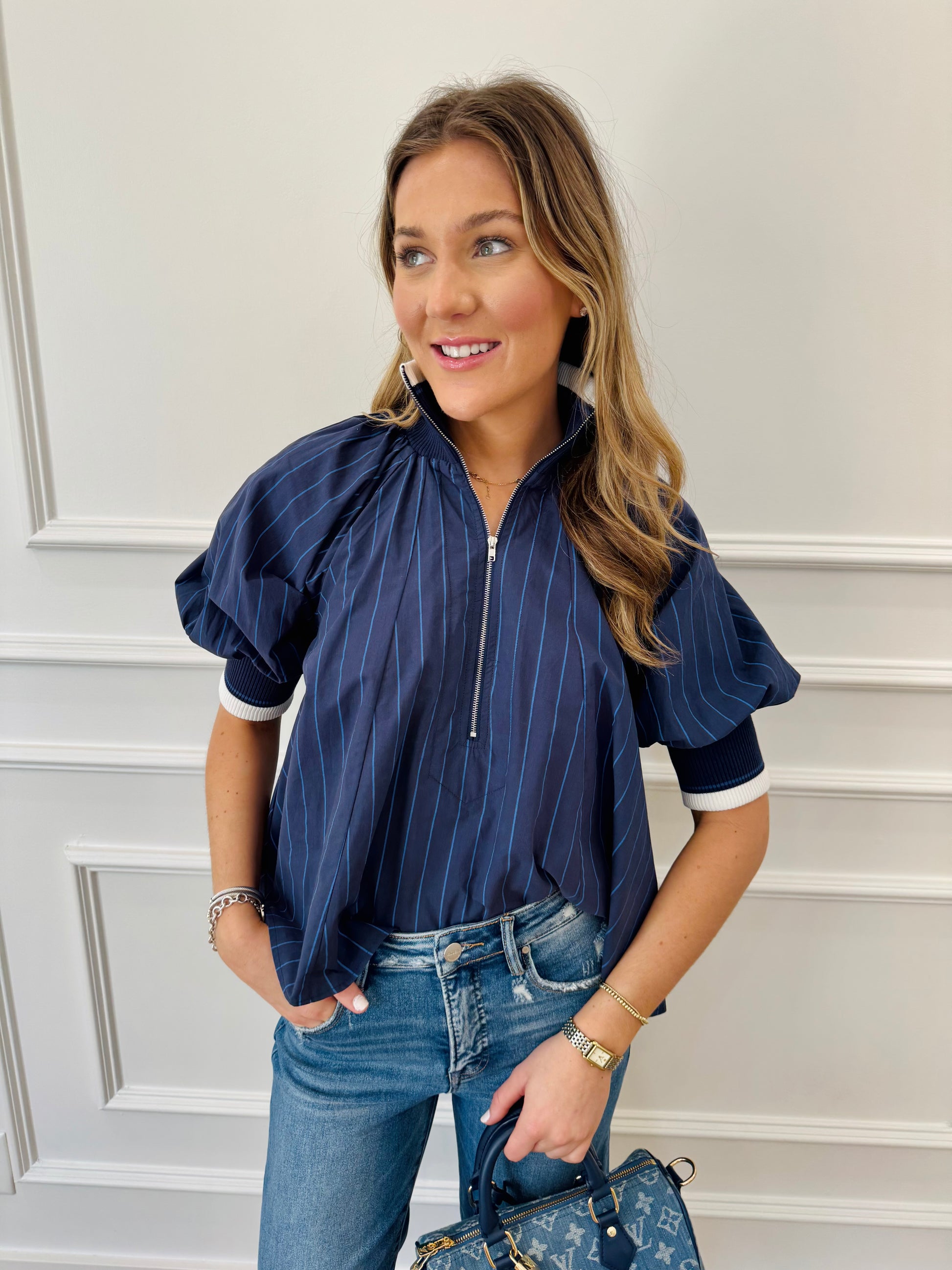 We are in love with the style. Such a classic preppy look. The subtle blue pins stripe pops on the navy background. Love the collar and arm cuff. Swing style fit. If in between sizes size up. Maggie is wearing the size small.