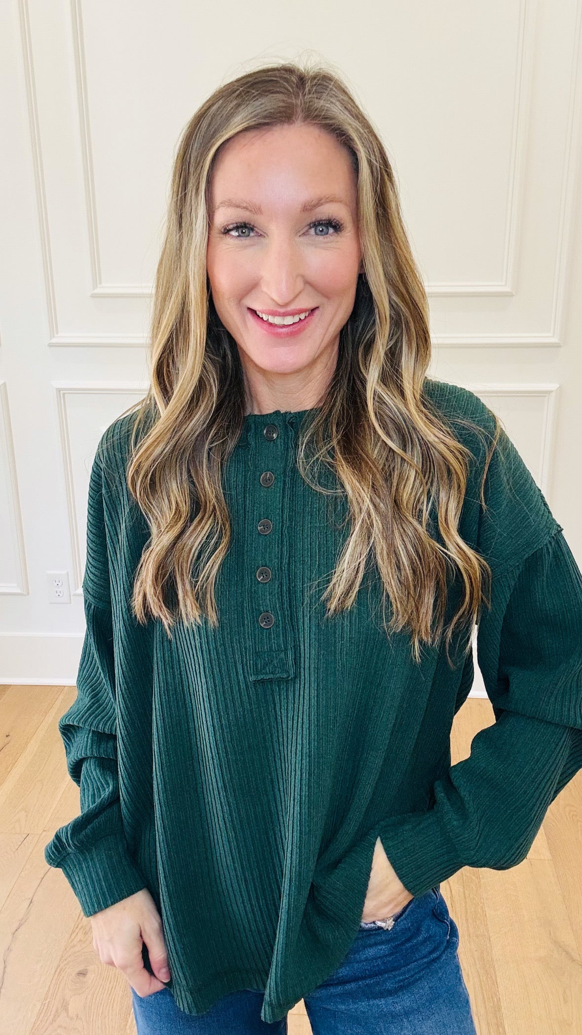 Super soft ribbed Henley is a gorgeous denier green. Runs true to size.