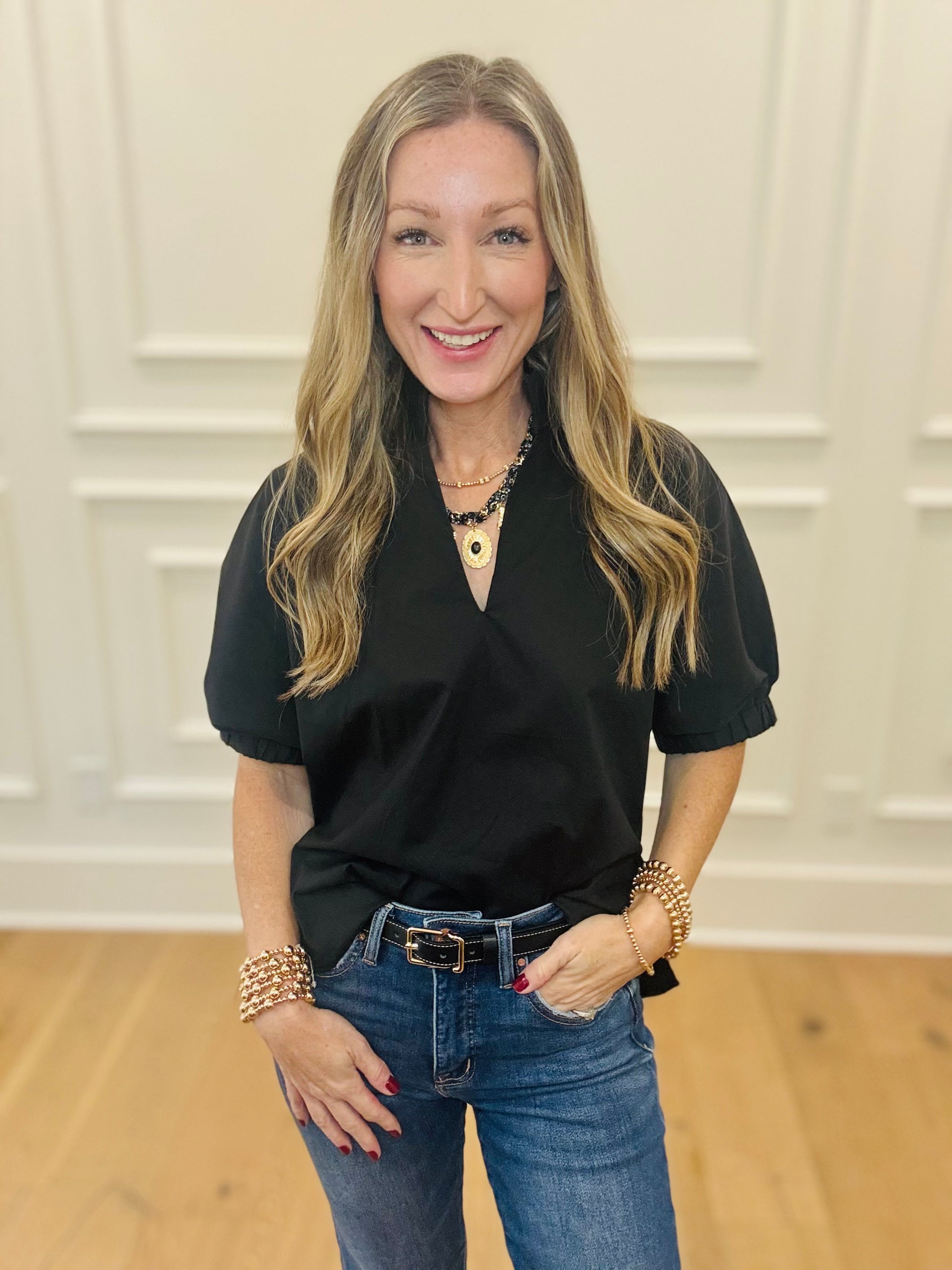 This great not so basic, basic! We are loving the collar with the vneck. A preppy, classic look. Runs true to size. Wearing the small