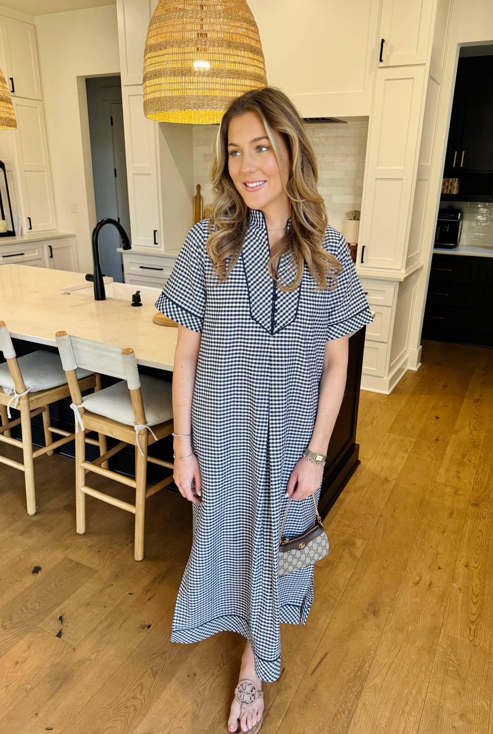 A best selling style now in this adorable gingham print. The popping around the neck line and the cute little buttons at the perfect touch. Fully lined with pockets. This could be cute worn dress down with a sneaker or dress it up with a ballet flat or wedge. Runs true to size. Wearing the small.